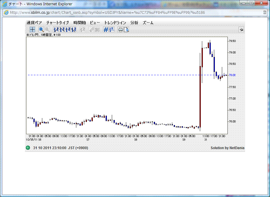 2011/10/31 - ぴっくさんの株式ブログ。タイトル:「日銀介入」 本文:75円台だった対ドル相場は、一時期79円台に。しかし、現在78円台前半に反落。日銀は二の矢、三の矢を継ぐつもりはあるのでしょうか。