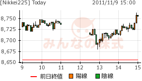 2011/11/10 - minnsann123さんの株式ブログ。タイトル:「11/09 NKは後場に安値確認か」 本文:後場に一段下げた後、反騰。結果的に25日移動線付近での動きとなった。 NK 画像1 為替は $77.7円、ユーロ