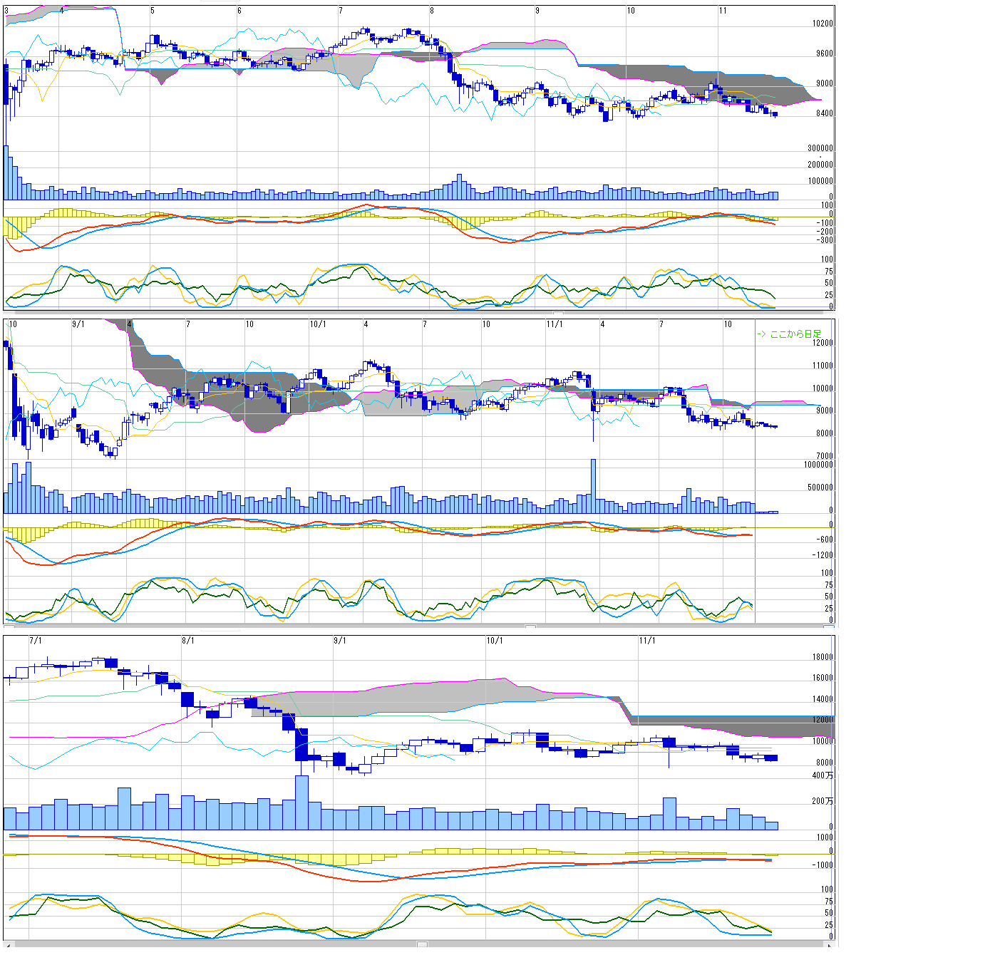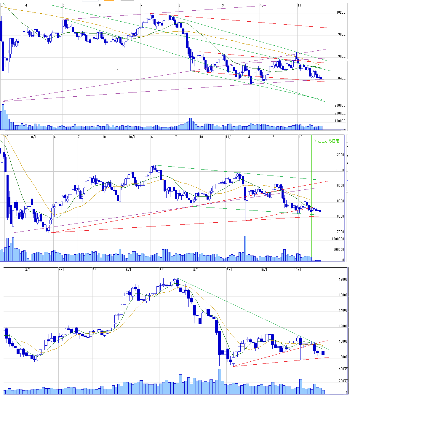 2011/11/20 - 月とスッポンさんの株式ブログ。タイトル:「11/2~ 来週のチャートポイント」 本文:日経先物 計算値 N=8310 E=8250(11・14高値)、8120(10・31高値)