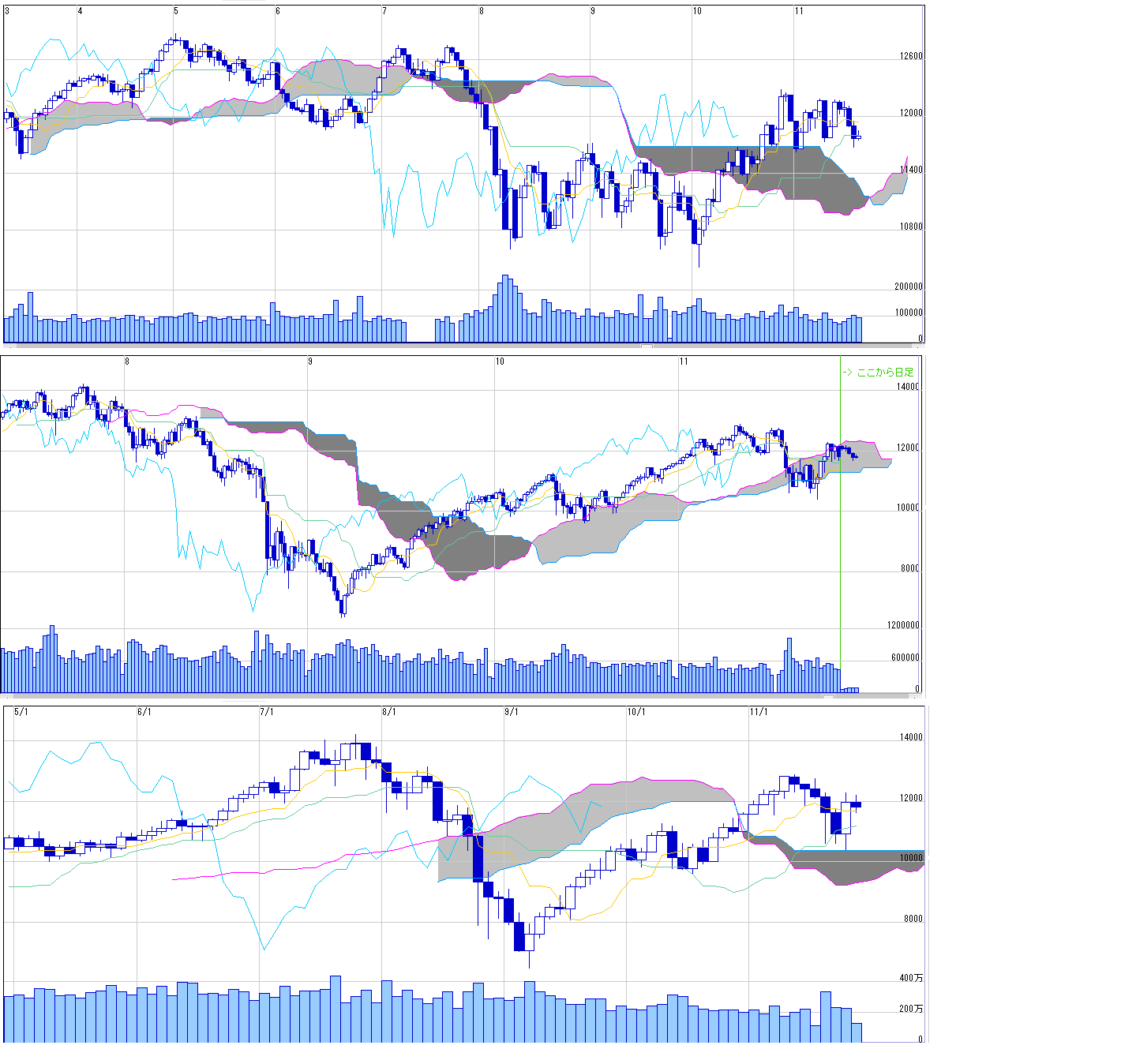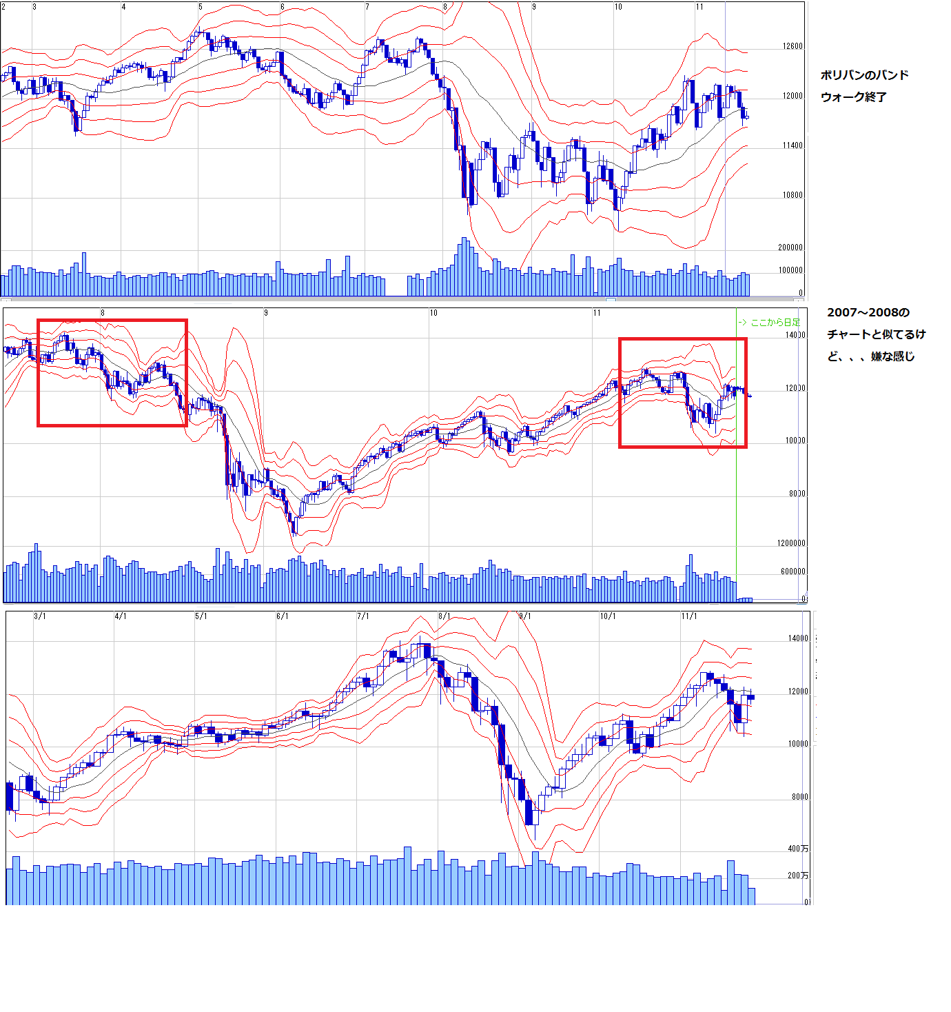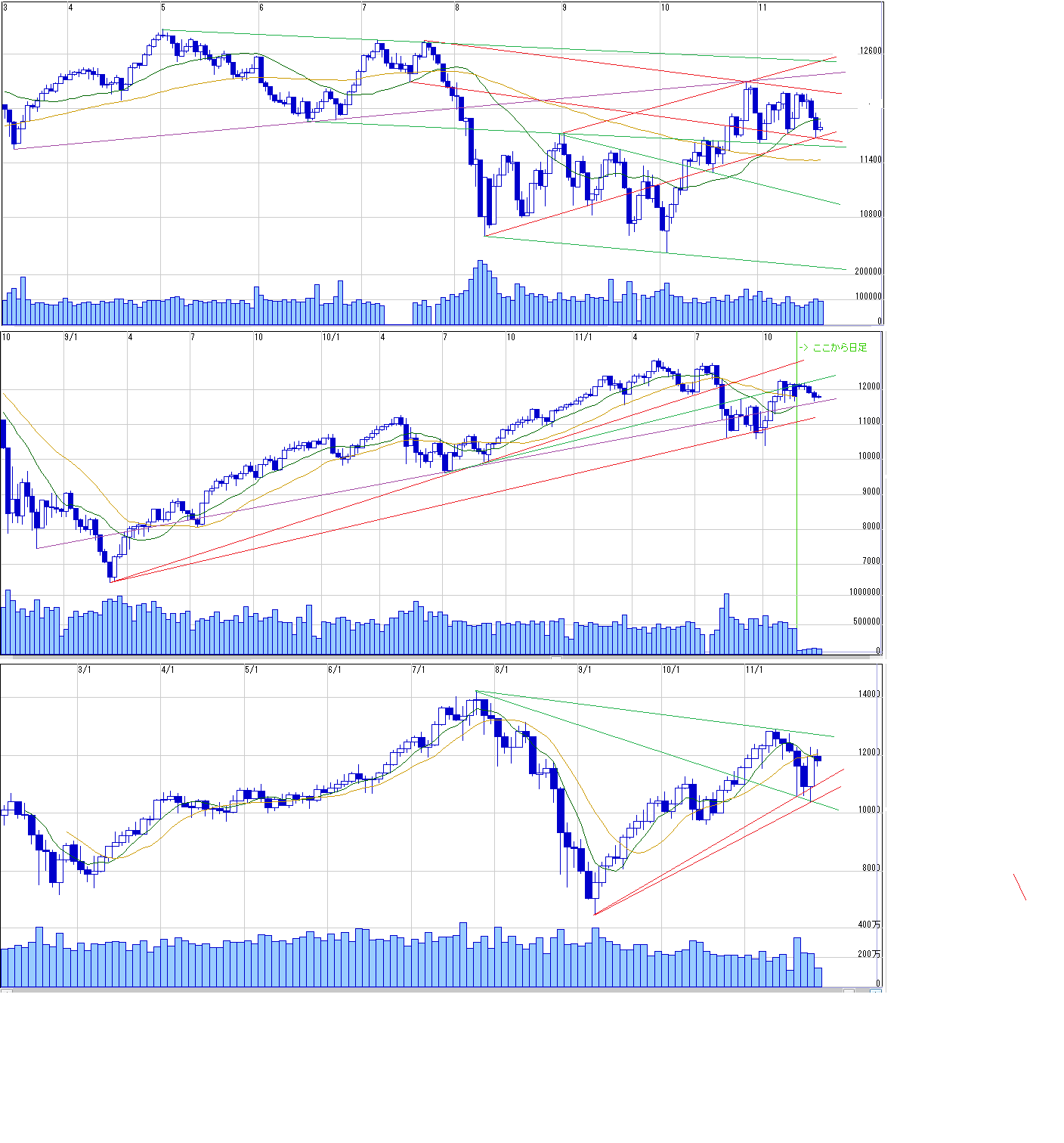 2011/11/20 - 月とスッポンさんの株式ブログ。タイトル:「11・21~ 来週のチャートポイント③」 本文:ダウ 計算値 N=11533 E=11293