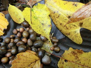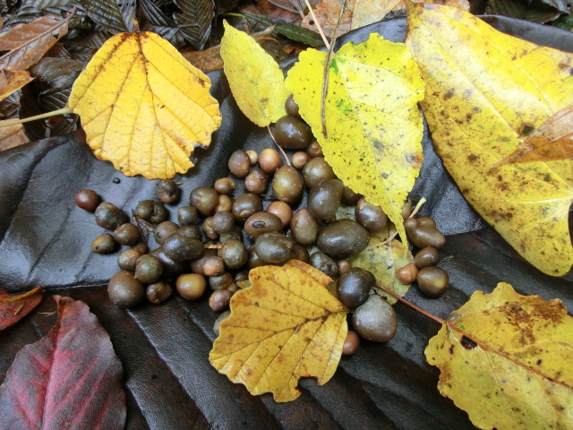 大きなホウノキの黒い落ち葉にムカゴが乗ってます