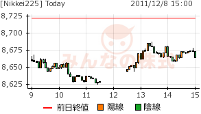 2011/12/08 - minnsann123さんの株式ブログ。タイトル:「12/08 8700円届かず。トレンド形成はまだ遠い。」 本文:一服感から始まり、一時100円安まで下げたが、後場に戻して小幅安で終えた。 NK 画像1 様子見の週末相場になるようだ。