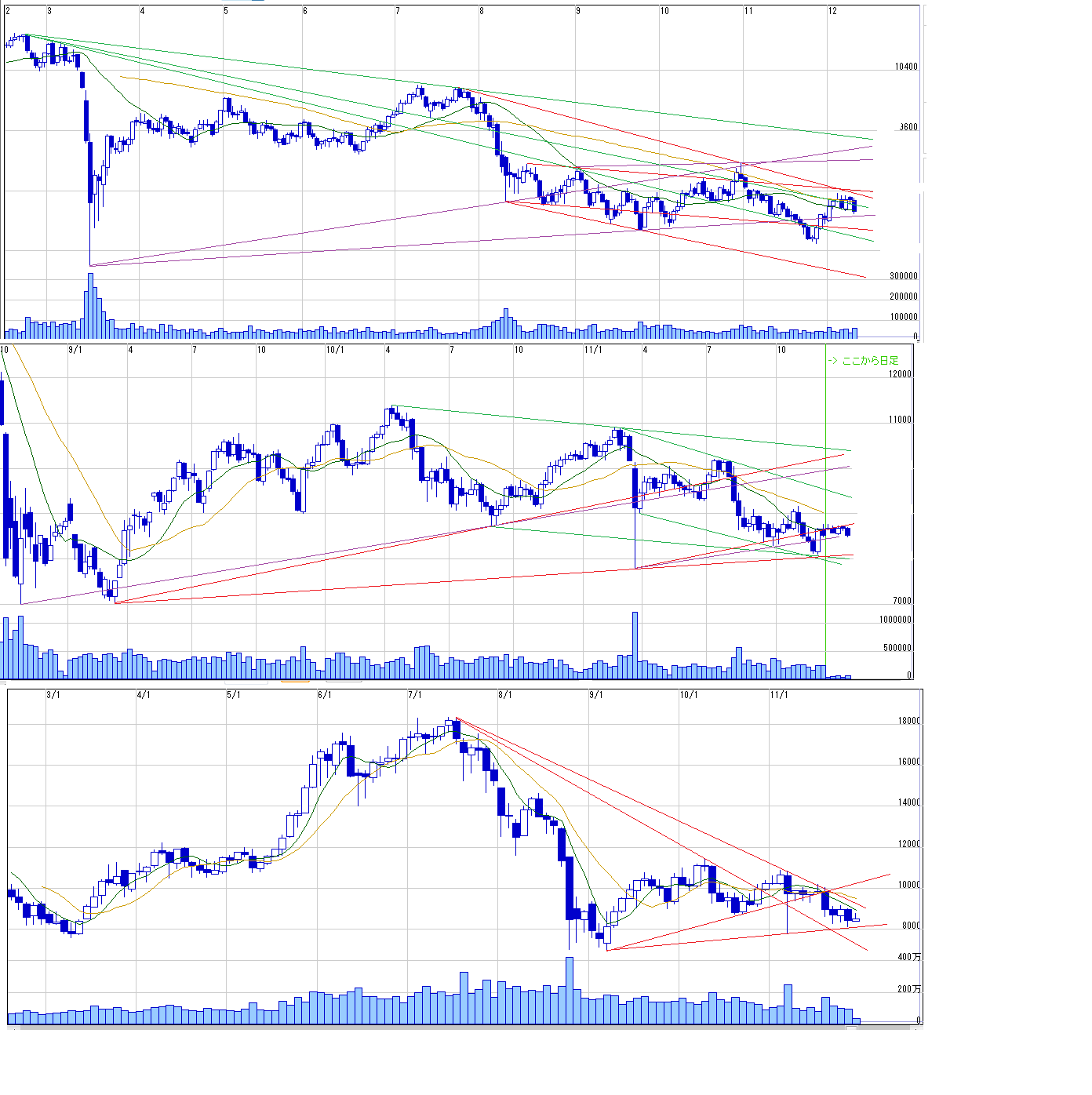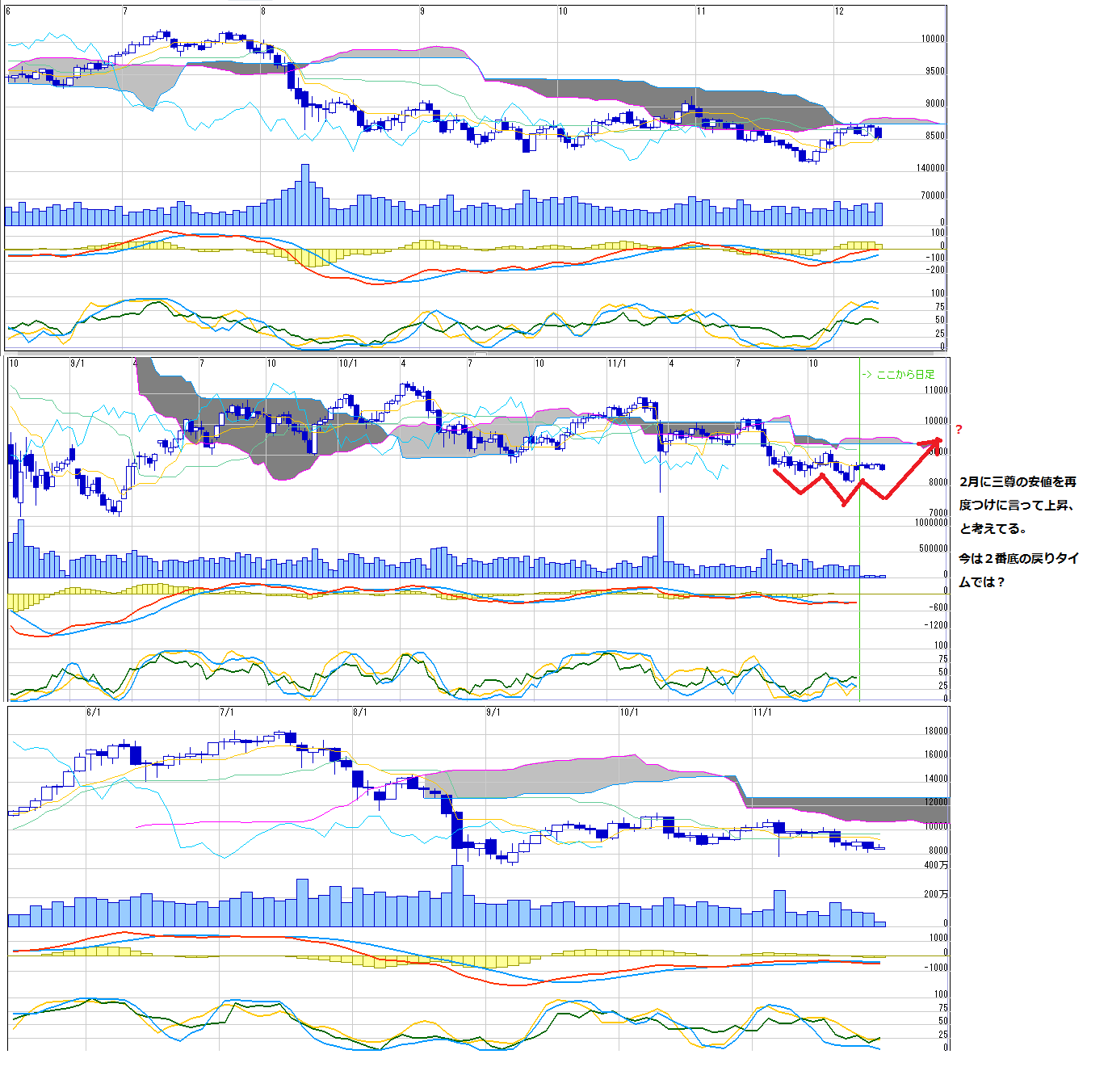 11月末の下げで三尊の2番底をつけて、その戻り過程に見えます。