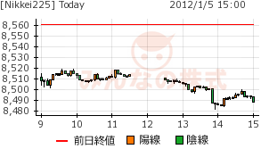 2012/01/06 - minnsann123さんの株式ブログ。タイトル:「1/5 25日移動線を下回った・・・」 本文:安値から始まり、後場には8500円を切り下げてしまった。円高、ユーロ安では、上げづらい局面と言われよう。 NK 画像1  為替は、ドルが76.7円と記録的安値。ユーロも99.2円で取引されていた。