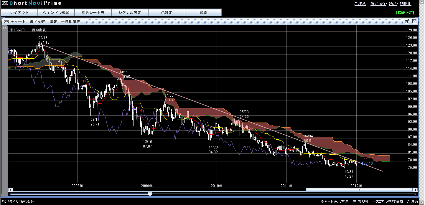 このラインを見ると、ドル円は78円辺りまで上げると、2007年からの下落トレンドが終わる!?