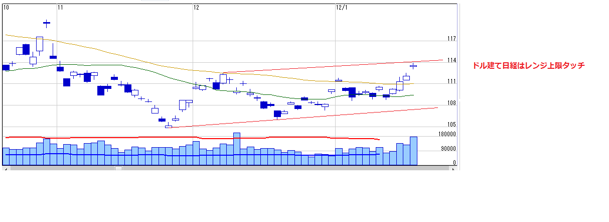 気になるのは、本日の上昇でドル建て日経のレンジ上限にタッチした事。