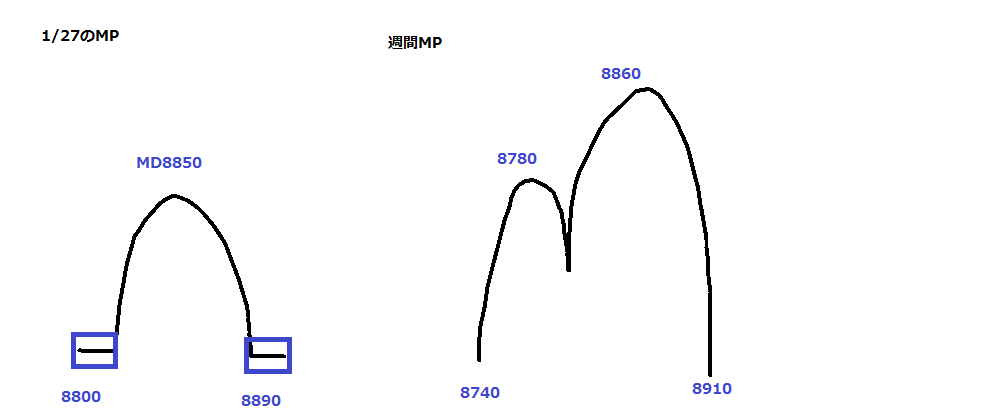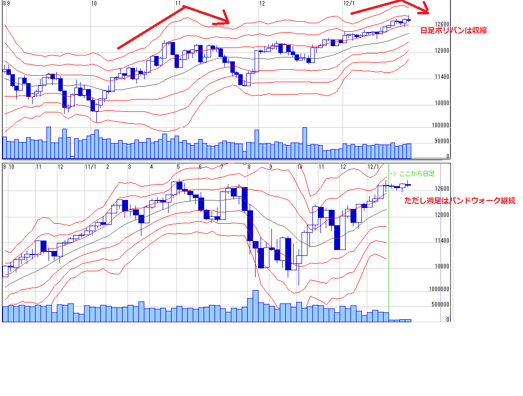 ただし、週足ボリバンはバンドウォーク継続で上昇トレンド継続なので、大きな流れはまだ上昇トレンドの範囲内といえます。