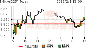 円高は変わらないが、3日連続の8780円から8830円で膠着している。日足は上髭付きの陽線。