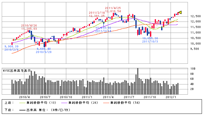 2012/02/04 - 影さんの株式ブログ。タイトル:「週足(~2/3)」 本文:週末の紐育市場は雇用統計改善の報を受け堅調に上昇。CMEも高値引けとのことで、週明けの東京市場も好スタートが予想されまするが、今後の展開を占う意味で、週足チャートを見ておきたいと存じまする。まずは吉例