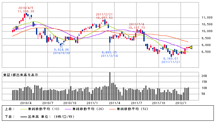 ただ光明が少し見えてきたのは、昨夏以降、株価は¥8,200前後で下げ止まっており、今は¥8,500に強固な壁があること。さらに年明けからの上昇相場で株価が26週線を越え、13週、26週線がようやく重い腰を上げ、僅かながら上向きになってきたことでござりましょう。