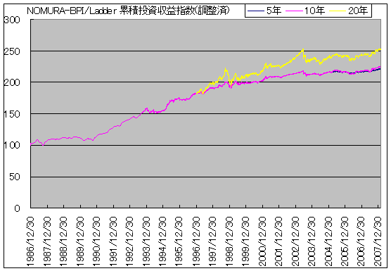 2008/02/23 - miyakenさんの株式ブログ。タイトル:「日本国債インデックス NOMURA-BPI/Ladder」 本文:日本国債のパフォーマンスを表すインデックスにはいろいろなものがありますが、個人投資家が追随可能なインデックスとしてNOMURA-BPI/Ladderがあります。