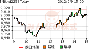 2012/02/10 - minnsann123さんの株式ブログ。タイトル:「2/9 下値を探るも、戻して小幅安。下髭付き6円の小陽線。」 本文:体調不良で記録中心に。 NK 画像1  為替は $77.1円~77.2円 夜77.3円で上昇中。 ユーロ102.1円~102.4円 夜102.8円で上昇中。 海外の株価
