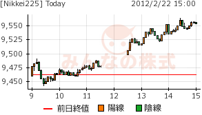 後場に、円安進行して、株価も出遅れ株や小型株が底上げ。9500円~9600円の窓を埋めようとしている。日足は、十字線後の陽線。調整が早くも終わりとなるのか・・・。上げの原因は明らかに円安。