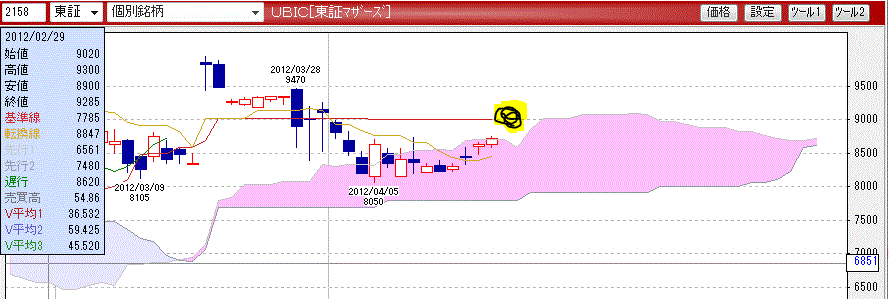 2012/04/19 - ☀サインは無限大☀(^∞^)☀さんの株式ブログ。タイトル:「一目均衡表の雲抜けて基準線で値を保つ」 本文:良い感じ。