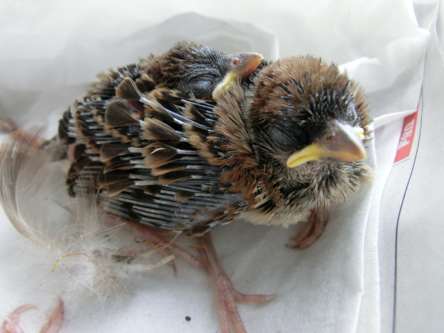夜勤明けで帰宅すると車庫の床に菓子箱が置いてあり、中に5羽のスズメの雛がいます