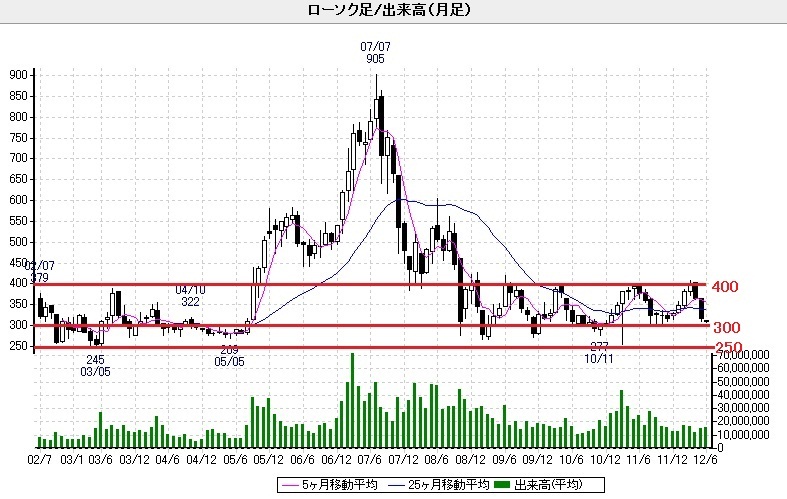 300円前後を揉み合いながら下は245円、高値は391で変動