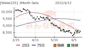 2012/06/14 - minnsann123さんの株式ブログ。タイトル:「6/14 後場に反騰。上放れるか・・・」 本文:今週は25日移動線が上値を重くしているが、見方によっては、ミニ三角ボックスを形成しつつある。 3ヶ月チャート 画像1