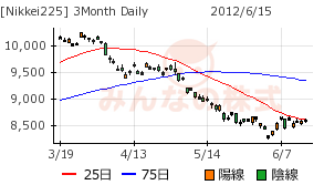 2012/06/18 - minnsann123さんの株式ブログ。タイトル:「6/17 今週は上昇に転ずるか。」 本文:先週は、ギリシャの再選挙前で、世界的に様子見気配が濃厚で、NKも上値の思い展開で、25日移動線が頭を押さえていた。で、週末にはついに25日移動線が8650円を下回った結果、金曜日の高値が25日移動線と