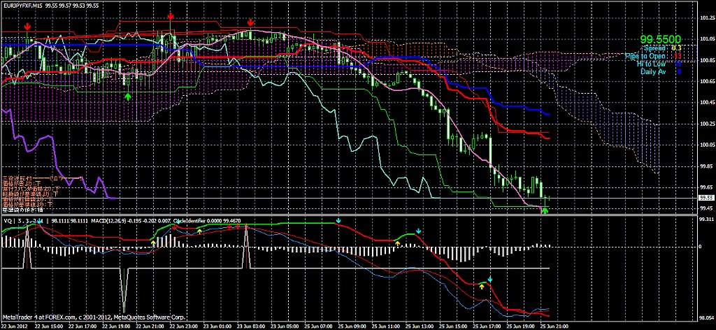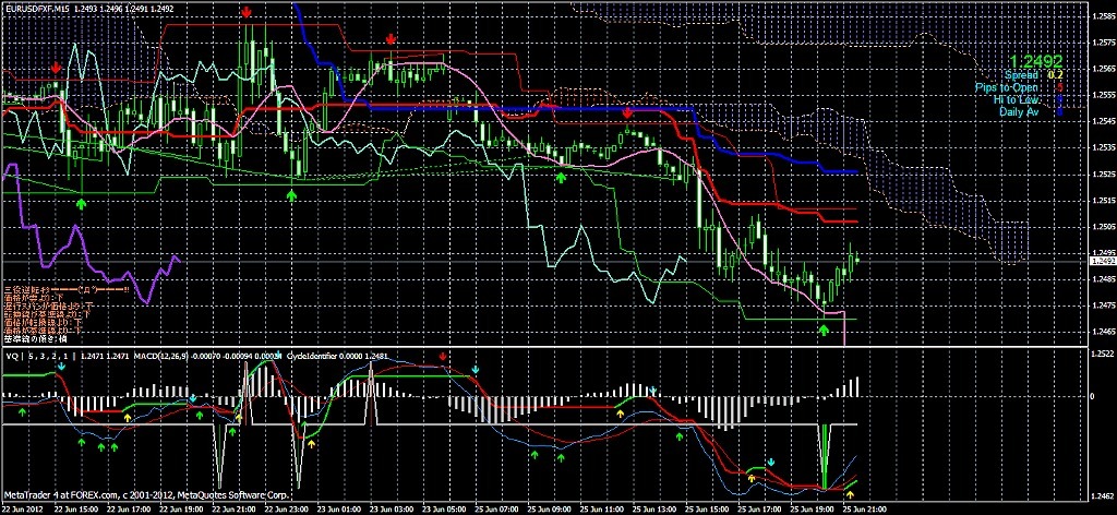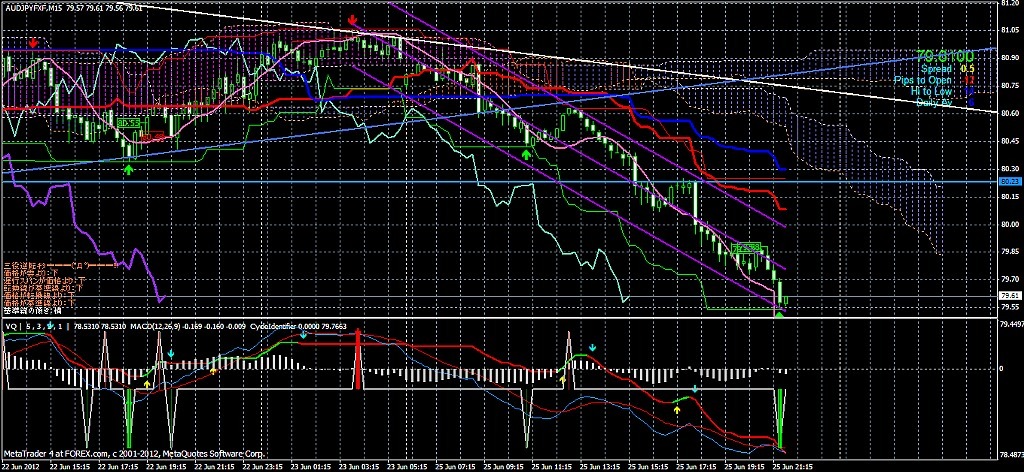 2012/06/25 - けろけろさんの株式ブログ。タイトル:「こんばんぎゃぁぁぁ!」 本文:左から ユロドル ユロ円 豪ドル・円上値が重かったので、S1とS2 辺りのフィボに指値置いておいて放置・・・ひでー事になってる。