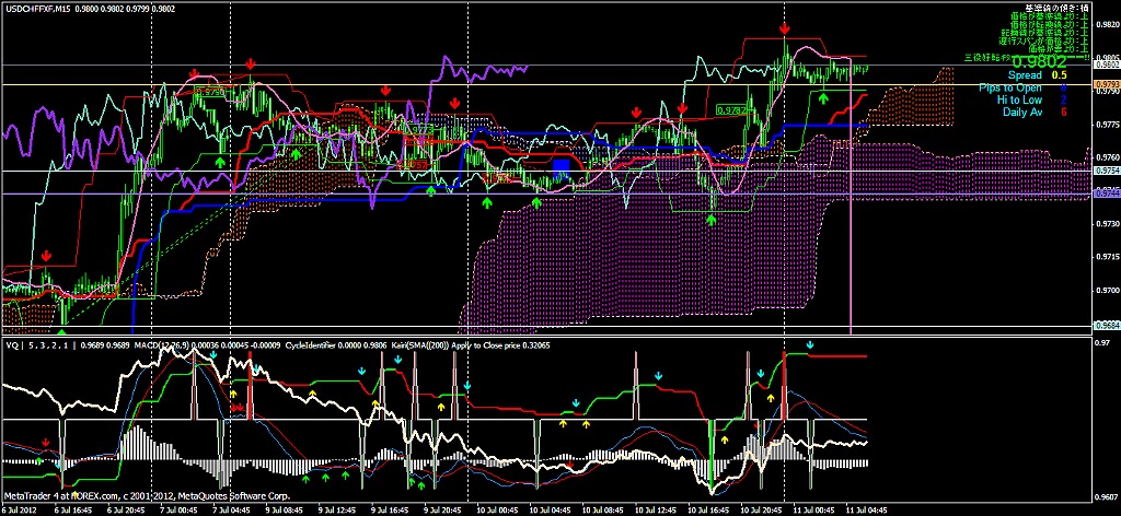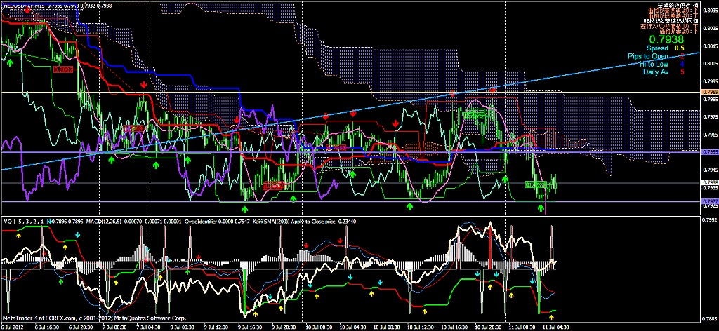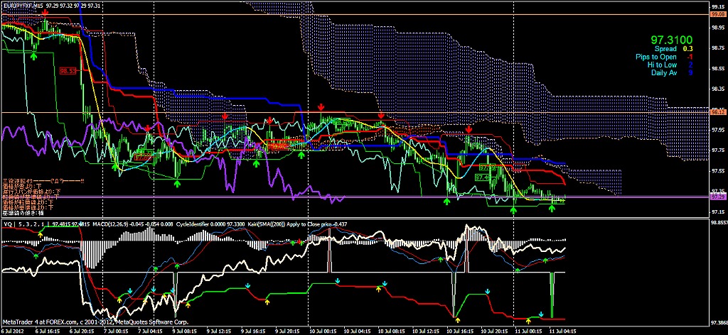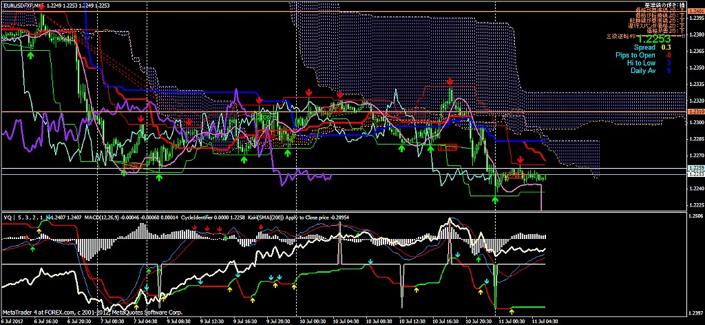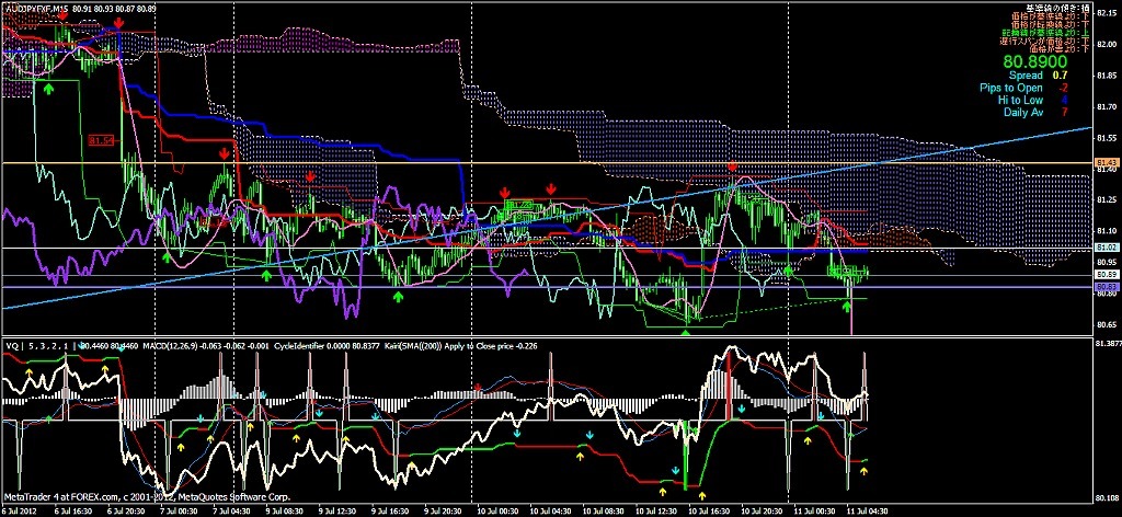 2012/07/12 - けろけろさんの株式ブログ。タイトル:「2012-07-12 15分足」 本文:2012-07-12 15分足左から ユーロ・ドル ユーロ・円 豪ドル・円ユーロドルは駄々下げ状態。 戻りらしい戻りもないので突っ込み売りをしていいものなのか・・・でもそろそろ戻りそう~