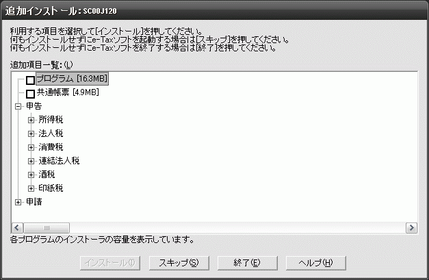 申告・申請等の手続きを利用するために、利用する税目のプログラムを追加インストールする必要があります。