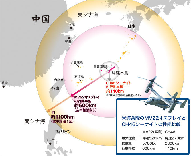 つまりは、輸送ヘリであるオスプレイが導入されると、従来機では無しえなかった補給なしでの尖閣や、空中補給1回で上海上陸が可能となってしまうということ。