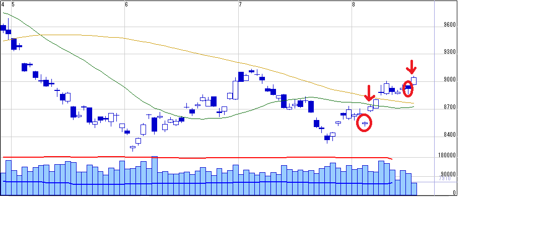 ボリバン上放れで上昇トレンド入りで9240を目指す、