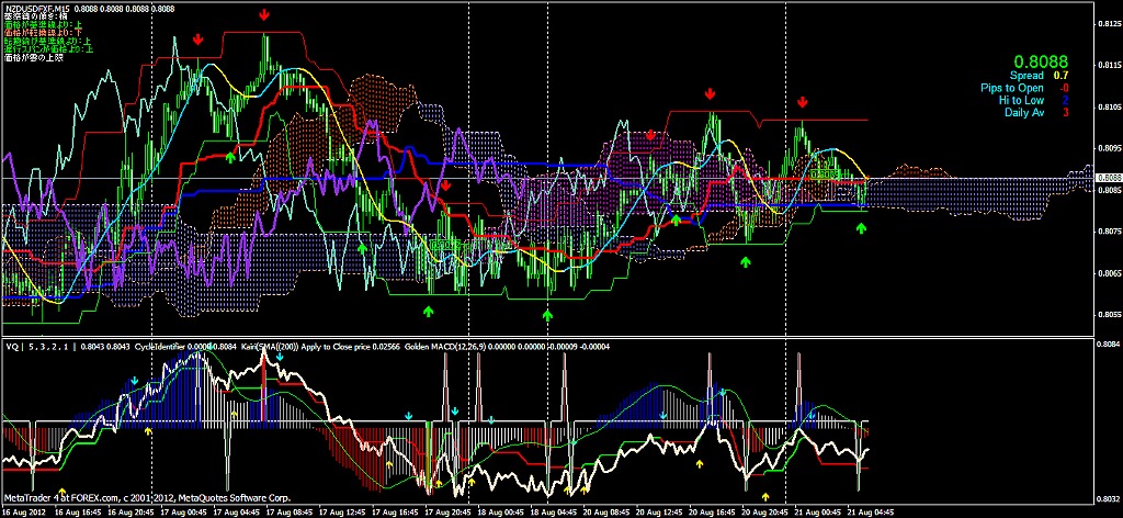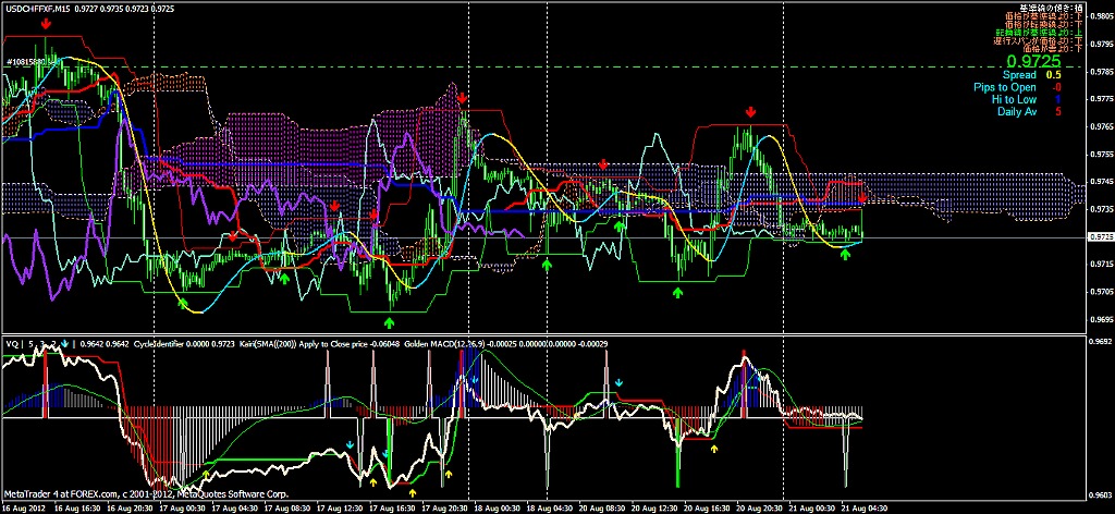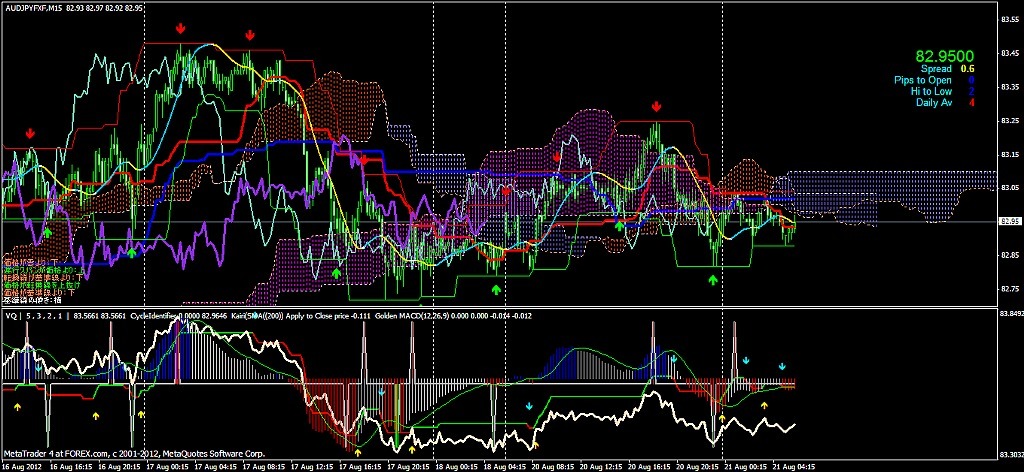 2012/08/24 - けろけろさんの株式ブログ。タイトル:「2012-08-24 15分足」 本文:左から ユロドル ユロ円 豪ドル円最近、ポジポジ病が発症 お昼に 60分足の一目均衡表の基準線・転換線 実線の乖離が激しいように(高値でヨコヨコ) 見えたので
