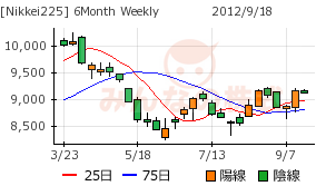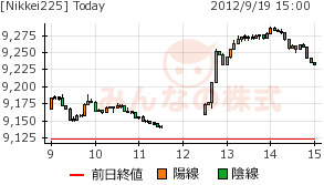 2012/09/19 - minnsann123さんの株式ブログ。タイトル:「9/19 NKは直近高値更新。日銀の金融緩和策で。」 本文:日銀が市場への十分な資金投入を発表したことで、後場は急騰した。 NK 画像3  その結果、9250円超えしたが、奇しくも4月に下げるときに空けた窓に突入している。 NK週足 画像2