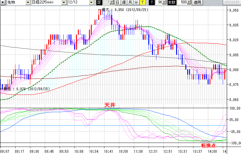 2012/09/25 - tensokoさんの株式ブログ。タイトル:「9/25 日中の株価の天井・転換点」 本文:9/25 日中の株価の天井・転換点 ↓クリックで画像拡大↓ ※指標ラインの密集点が天底・転換点を示します。指標の見方日経225mini先物チャート : 96ティック足天井 : 9050 (9/25