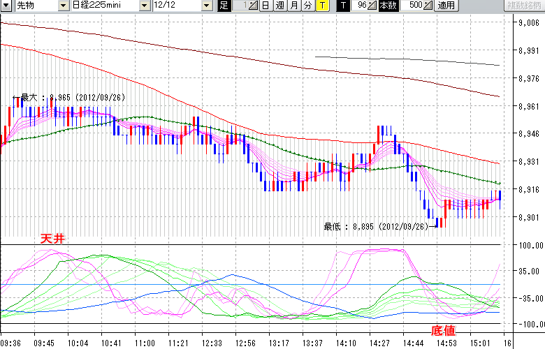 2012/09/26 - tensokoさんの株式ブログ。タイトル:「9/26 日中の株価の天底」 本文:9/26 日中の株価の天底 ↓クリックで画像拡大↓ ※指標ラインの密集点が天底・転換点を示します。指標の見方日経225mini先物チャート : 96ティック足天井 : 8965 (9/26