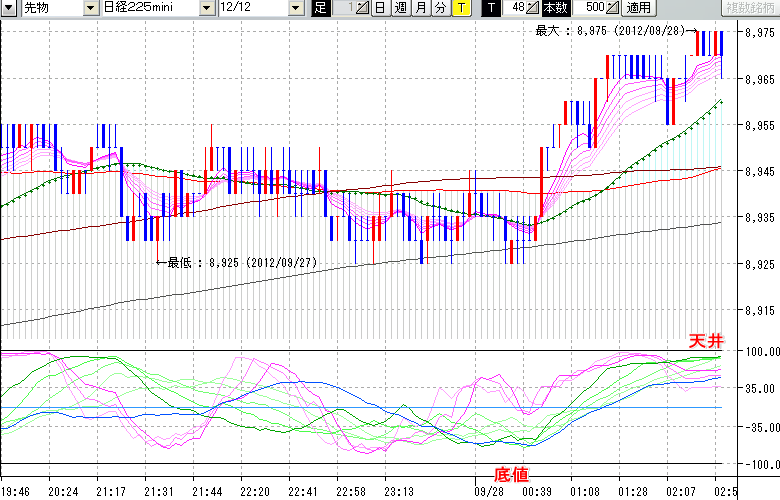 2012/09/28 - tensokoさんの株式ブログ。タイトル:「9/27 夜間の株価の天底」 本文:9/27 夜間の株価の天底 ↓クリックで画像拡大↓ ※指標ラインの密集点が天底・転換点を示します。指標の見方日経225mini先物チャート : 96ティック足底値 : 8925 (9/28