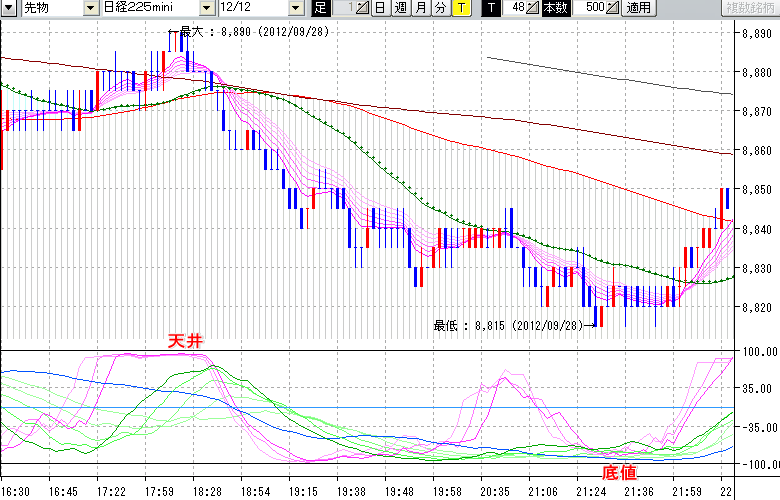 2012/09/29 - tensokoさんの株式ブログ。タイトル:「9/28 夜間の株価の天底」 本文:9/28 夜間の株価の天底 ↓クリックで画像拡大↓ ※指標ラインの密集点が天底・転換点を示します。指標の見方日経225mini先物チャート : 48ティック足天井 : 8890 (9/28