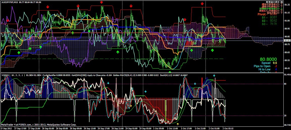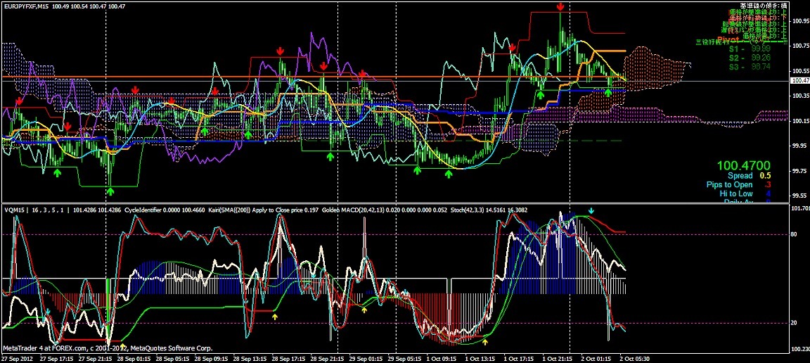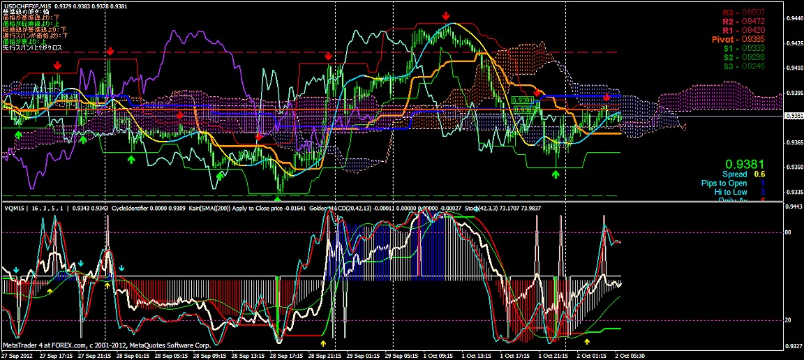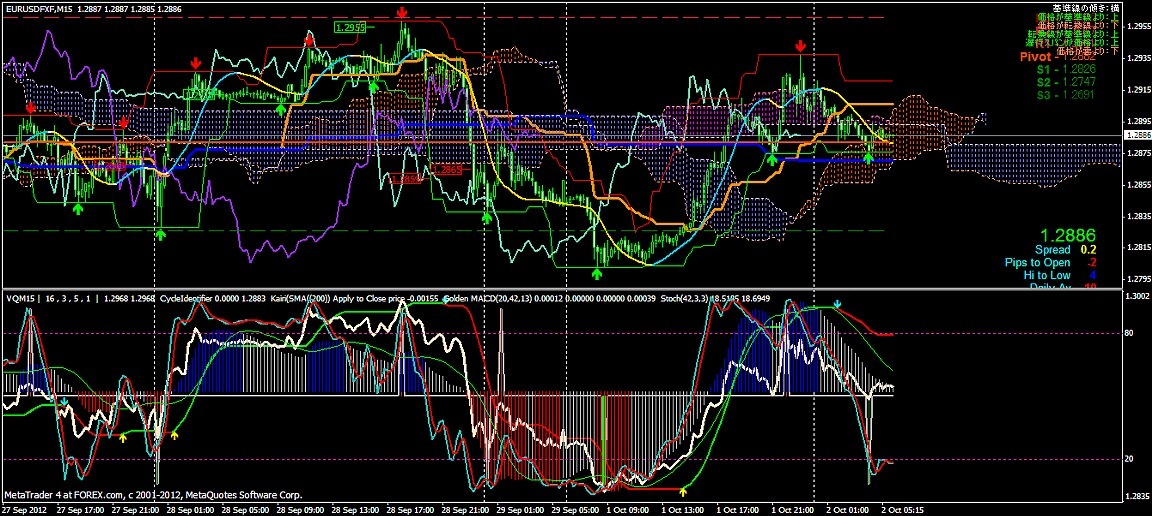 2012/10/02 - けろけろさんの株式ブログ。タイトル:「FX 2012-10-02 15分足」 本文:左からユーロドル ユーロ・円 豪ドル・円(時間足は真ん中に 5分足は真ん中から)っと気に留めてみよう~ユーロドル 朝方の下げ下げからS目線だったけど1.28辺りの攻防で戻してきちゃった。