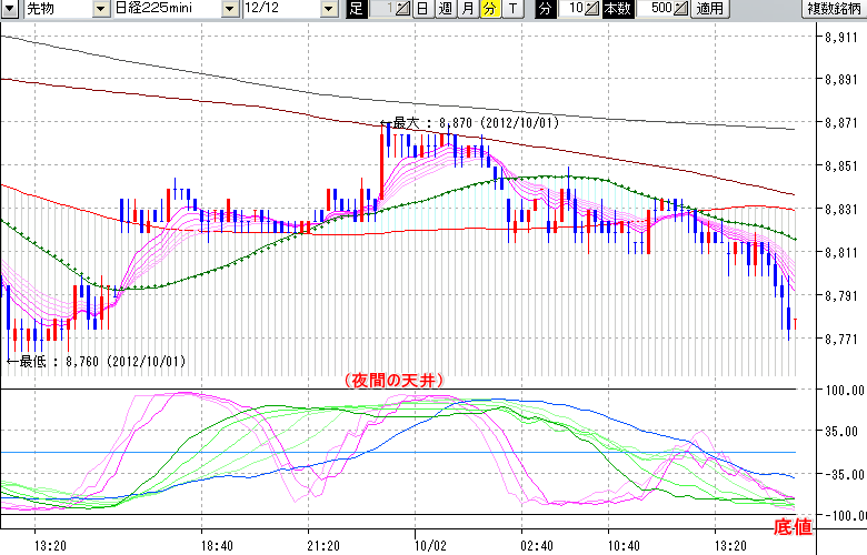 2012/10/02 - tensokoさんの株式ブログ。タイトル:「10/2 日中の株価の底値」 本文:10/2 日中の株価の底値 ↓クリックで画像拡大↓ ※指標ラインの密集点が天底・転換点を示します。指標の見方日経225mini先物チャート : 10分足底値 : 8770 (10/2