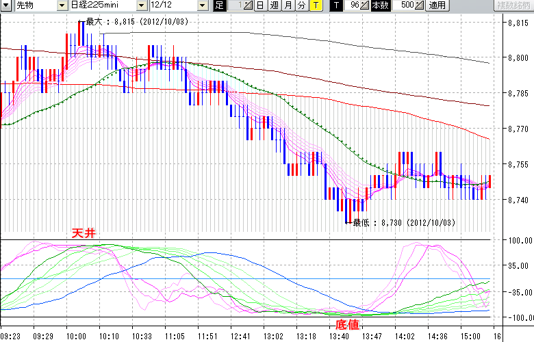 2012/10/03 - tensokoさんの株式ブログ。タイトル:「10/3 日中の株価の天底」 本文:10/3 日中の株価の天底 ↓クリックで画像拡大↓ ※指標ラインの密集点が天底・転換点を示します。指標の見方日経225mini先物チャート : 96ティック足天井 : 8815 (10/3