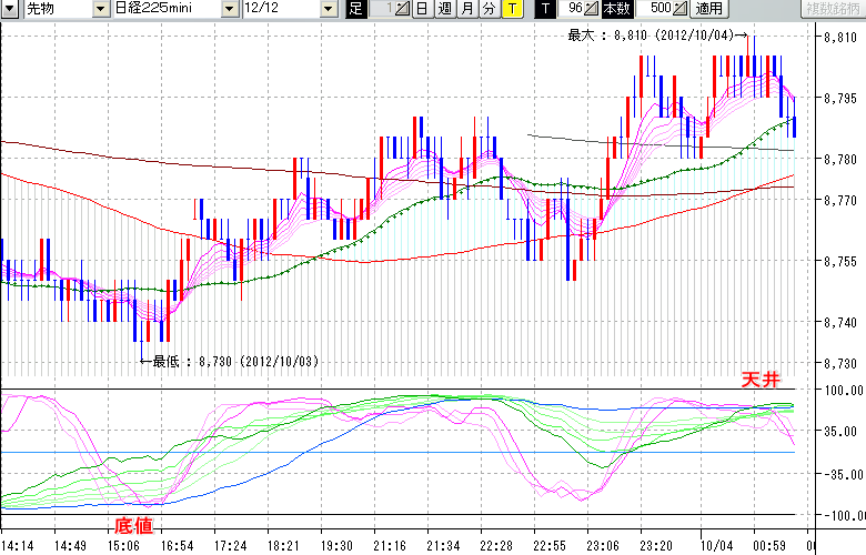 2012/10/04 - tensokoさんの株式ブログ。タイトル:「10/3 夜間の株価の天底」 本文:10/3 夜間の株価の天底 ↓クリックで画像拡大↓ ※指標ラインの密集点が天底・転換点を示します。指標の見方日経225mini先物チャート : 96ティック足底値 : 8730 (10/3