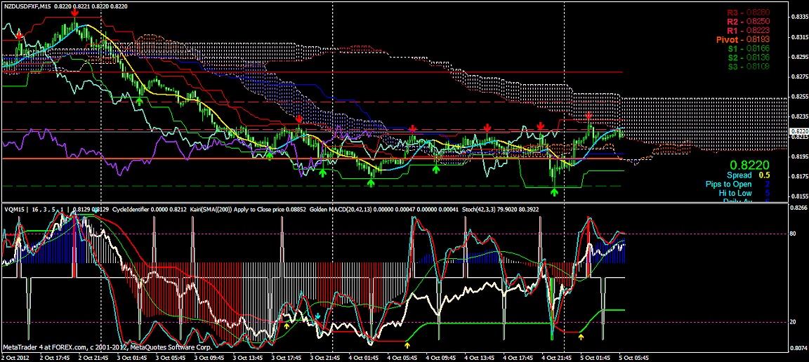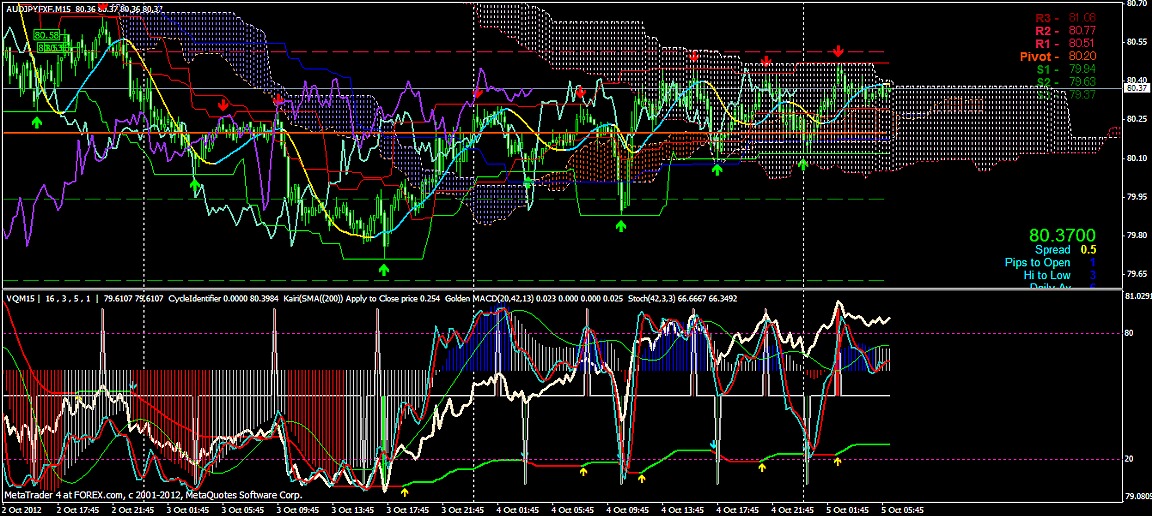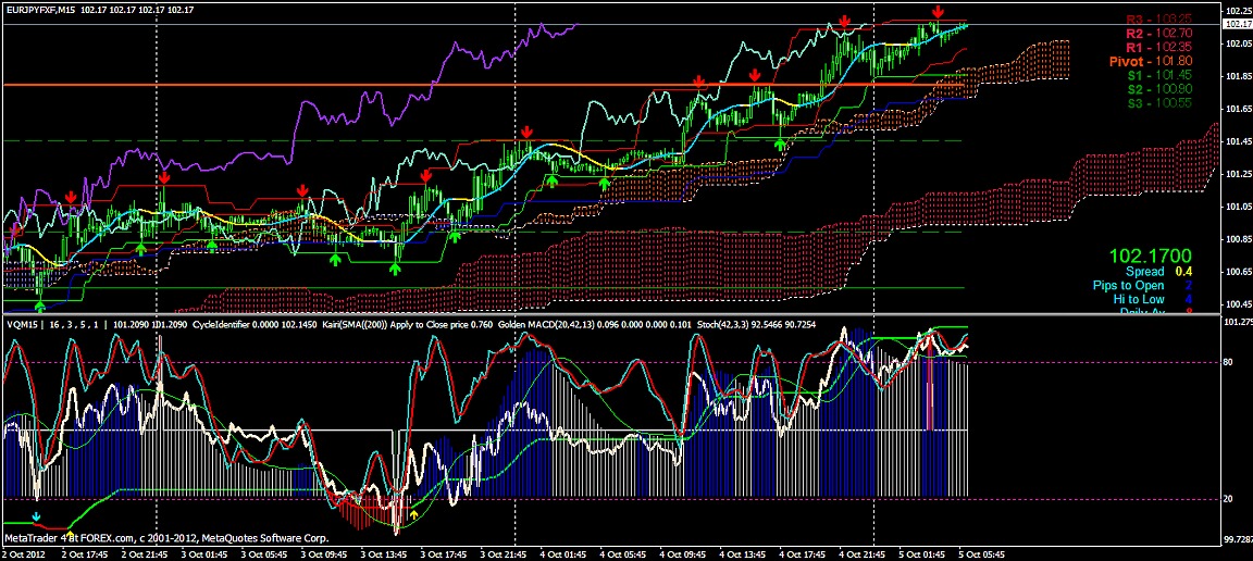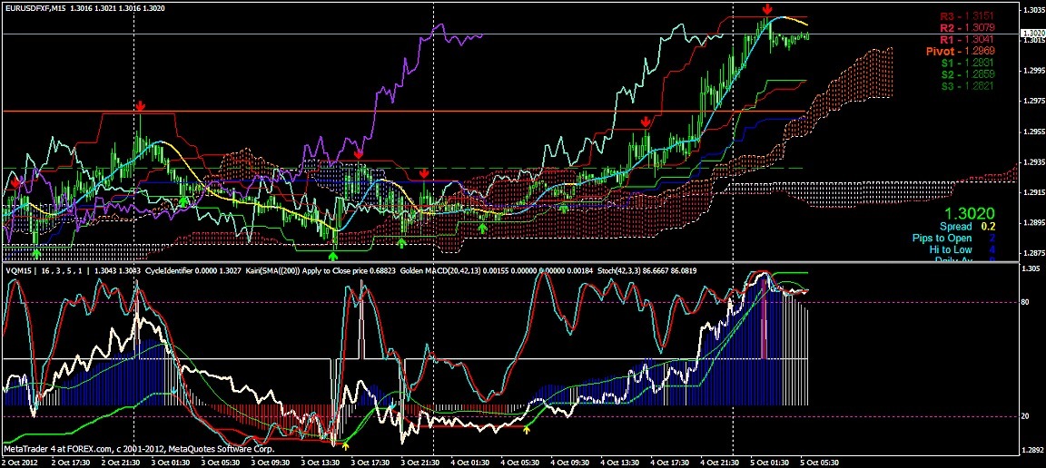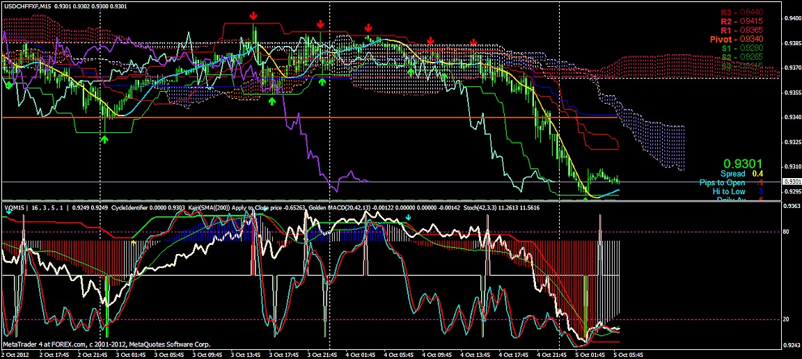 2012/10/05 - けろけろさんの株式ブログ。タイトル:「FX 2012-10-05 15分足」 本文:左からユーロドル ユーロ・円 豪ドル・円(時間足は真ん中に 5分足は真ん中から)っと気に留めてみよう~ユーロ・ドルが上がっています。下の方のSポジが今度は煌々と赤く輝き出しました。