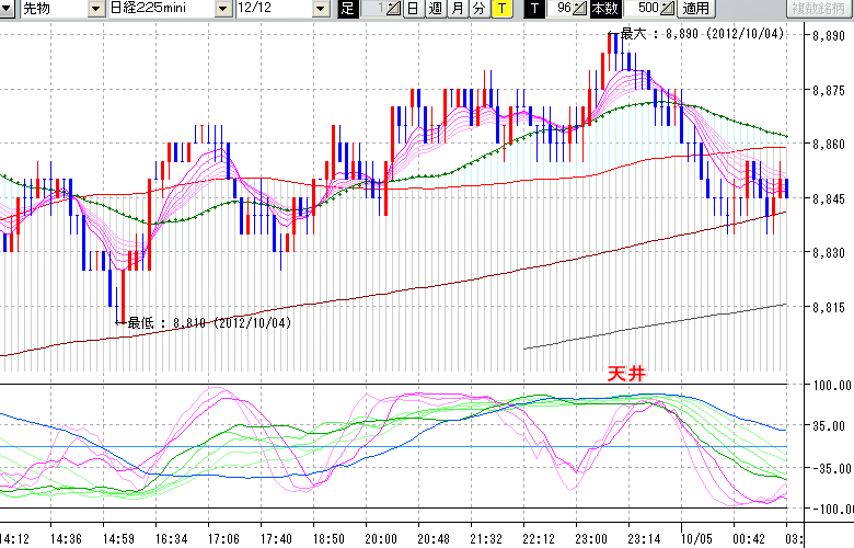 2012/10/05 - tensokoさんの株式ブログ。タイトル:「10/4 夜間の株価の天井」 本文:10/4 夜間の株価の天井 ↓クリックで画像拡大↓ ※指標ラインの密集点が天底・転換点を示します。指標の見方日経225mini先物チャート : 96ティック足天井 : 8890 (10/4