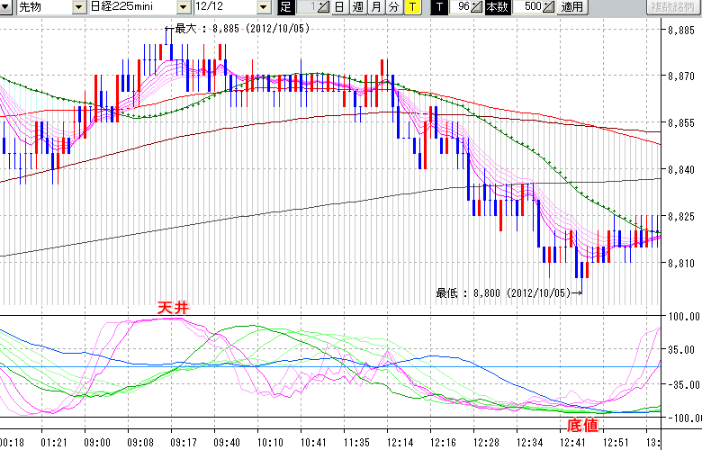 2012/10/05 - tensokoさんの株式ブログ。タイトル:「10/5 日中の株価の天底」 本文:10/5 日中の株価の天底 ↓クリックで画像拡大↓ ※指標ラインの密集点が天底・転換点を示します。指標の見方日経225mini先物チャート : 96ティック足天井 : 8885 (10/5