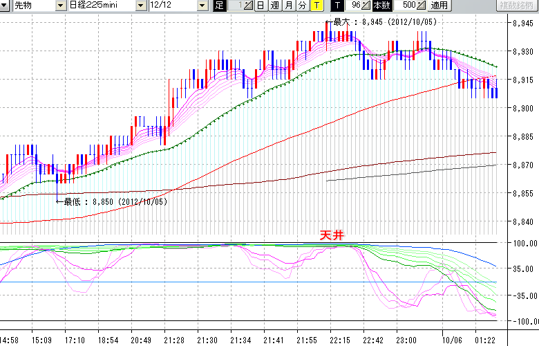 2012/10/06 - tensokoさんの株式ブログ。タイトル:「10/5 夜間の株価の天井」 本文:10/5 夜間の株価の天井 ↓クリックで画像拡大↓ ↓クリックで画像拡大↓ ※指標ラインの密集点が天底・転換点を示します。指標の見方日経225mini先物チャート(上) :