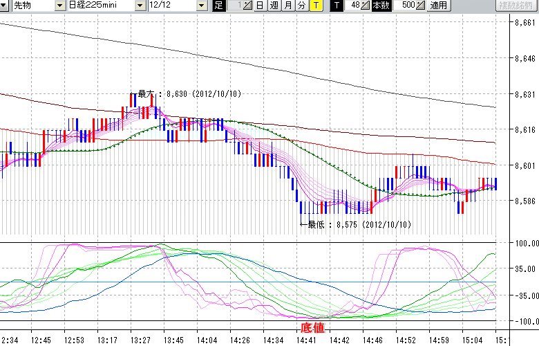 2012/10/10 - tensokoさんの株式ブログ。タイトル:「10/10 日中の株価の底値」 本文:10/10 日中の株価の底値 ↓クリックで画像拡大↓ ※指標ラインの密集点が天底・転換点を示します。指標の見方日経225mini先物チャート : 48ティック足底値 : 8575 (10/10