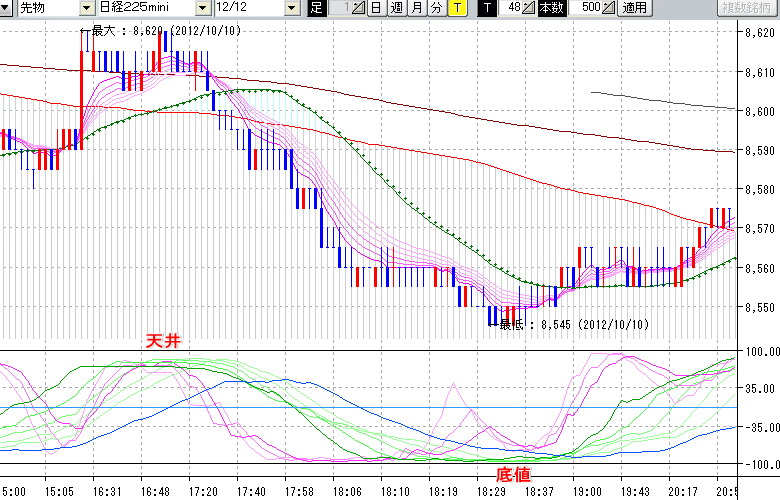 2012/10/11 - tensokoさんの株式ブログ。タイトル:「10/10 夜間の株価の天底」 本文:10/10 夜間の株価の天底 ↓クリックで画像拡大↓ ※指標ラインの密集点が天底・転換点を示します。指標の見方日経225mini先物チャート : 48ティック足天井 : 8620 (10/10