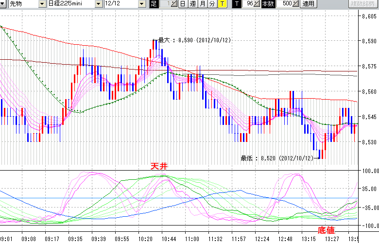 2012/10/12 - tensokoさんの株式ブログ。タイトル:「10/12 日中の株価の天底」 本文:10/12 日中の株価の天底↓クリックで画像拡大↓ ※指標ラインの密集点が天底・転換点を示します。指標の見方日経225mini先物チャート : 96ティック足天井 : 8590 (10/12