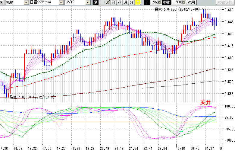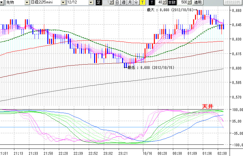 2012/10/16 - tensokoさんの株式ブログ。タイトル:「10/15 夜間の株価の天井」 本文:10/15 夜間の株価の天井 ↓クリックで画像拡大↓ ↓クリックで画像拡大↓ ※指標ラインの密集点が天底・転換点を示します。指標の見方日経225mini先物チャート(上) :
