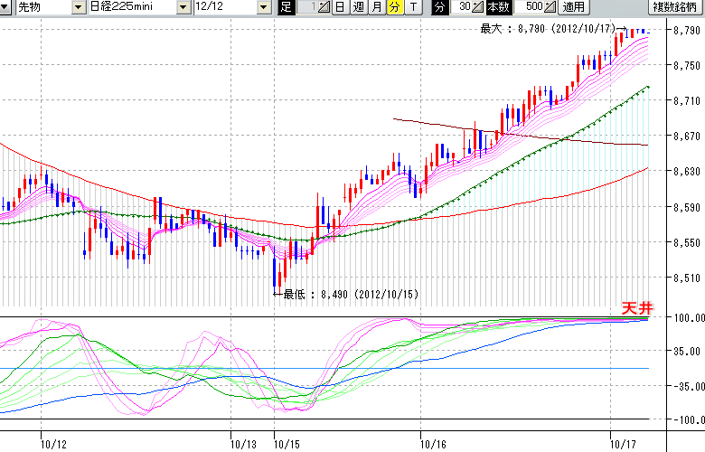 2012/10/17 - tensokoさんの株式ブログ。タイトル:「10/16 夜間の株価の天井」 本文:10/16 夜間の株価の天井 ↓クリックで画像拡大↓ ※指標ラインの密集点が天底・転換点を示します。指標の見方日経225mini先物チャート : 30分足天井 : 8790 (10/17