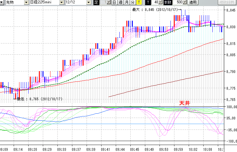 2012/10/17 - tensokoさんの株式ブログ。タイトル:「10/17 日中の株価の天井」 本文:10/17 日中の株価の天井 ↓クリックで画像拡大↓ ※指標ラインの密集点が天底・転換点を示します。指標の見方日経225mini先物チャート : 48ティック足天井 : 8845 (10/17