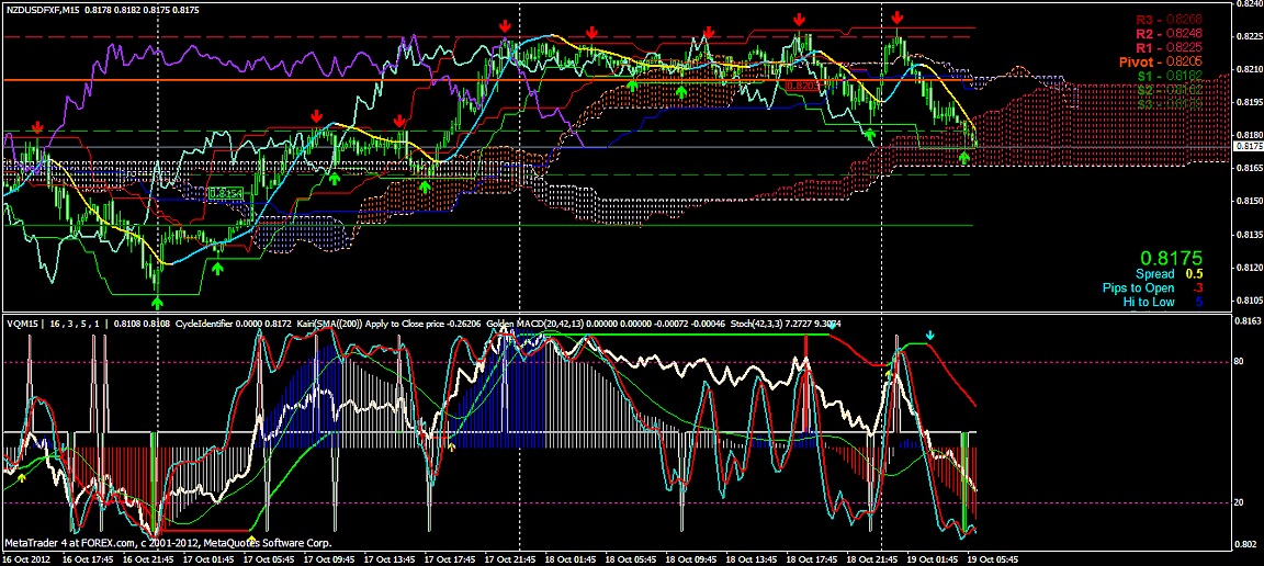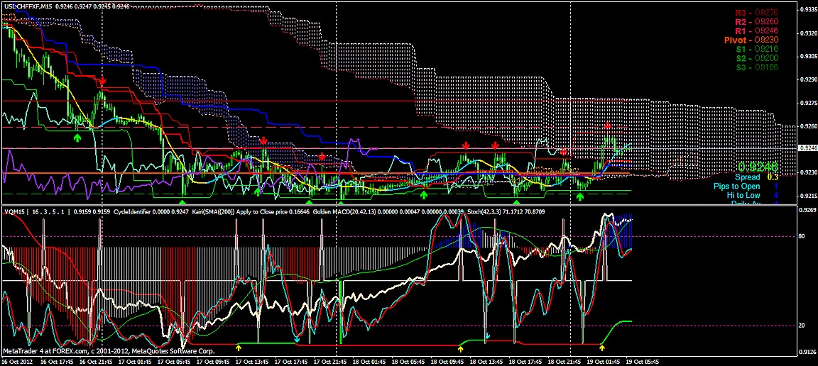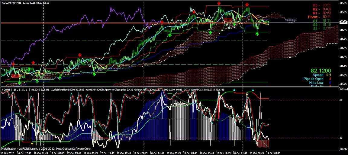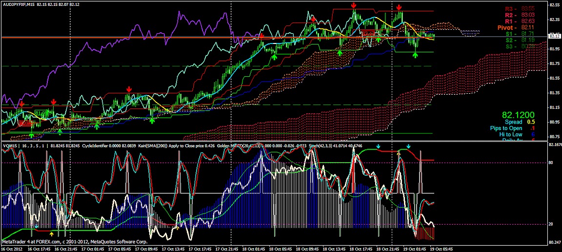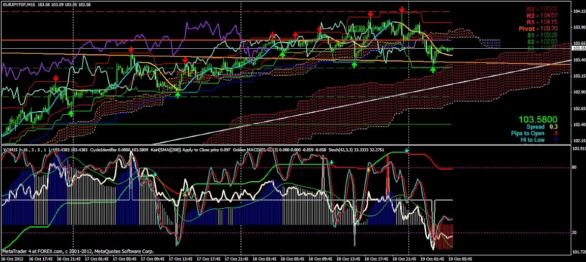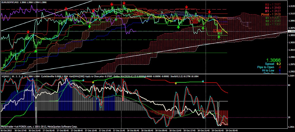 2012/10/19 - けろけろさんの株式ブログ。タイトル:「FX 2012-10-19 15分足」 本文:左からユーロドル ユーロ・円 豪ドル・円(時間足は真ん中に 5分足は真ん中から)っと気に留めてみよう~ちっ! ユロドル S1.312のポジ。 早々に手放すんじゃ無かったよ~落ちてきた。