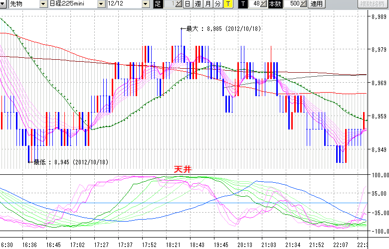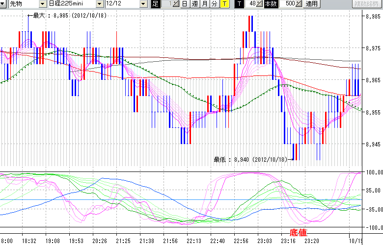 2012/10/19 - tensokoさんの株式ブログ。タイトル:「10/18 夜間の株価の天底」 本文:10/18 夜間の株価の天底 ↓クリックで画像拡大↓ ↓クリックで画像拡大↓ ※指標ラインの密集点が天底・転換点を示します。指標の見方日経225mini先物チャート(上) :