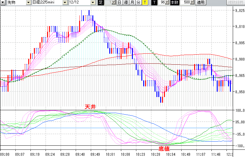 日経225mini先物チャート(上) : 96ティック足